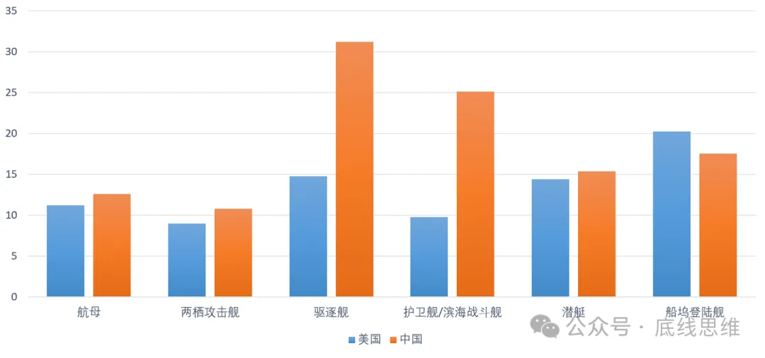 2010年以后美国海军入役各类舰种的吨位已经全方位落后于中国,而随着两国工业与技术的消长,这种差距料将继续拉大。图表来源:作者自制。