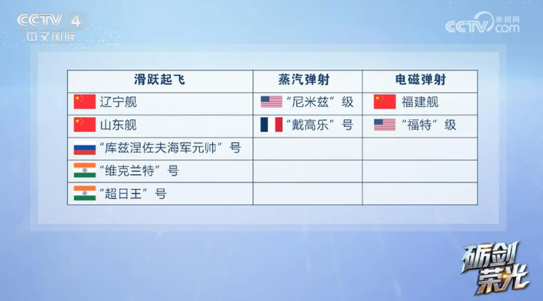 资料显示,目前,中国海军辽宁舰和山东舰、俄罗斯海军现役唯一一艘航母“库兹涅佐夫海军元帅”号,以及印度海军的两艘航母均采用滑跃起飞。采用蒸汽弹射的包括美海军现役10艘“尼米兹”级航母以及法国海军唯一一艘航母“戴高乐”号。美军新一代航母“福特”级则采用电磁弹射。