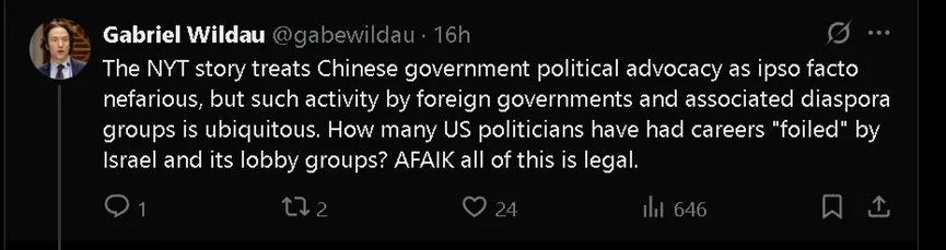 这位美国媒体人名叫Gabriel Wildau,曾在英国《金融时报》和路透社供职。在一则社交网站上的帖文中,Wildau就对《纽约时报》为何要把中国与纽约华人团体的互动说得这么恶劣感到奇怪,因为外国使领馆与自己海外侨民互动是很平常的,也是合法的。Wildau认为,真要说起干涉美国内政、影响美国选举的事,那以色列才是需要说说的。