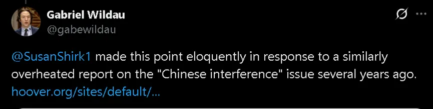 这里,他还贴出了美国知名“中国通”、加州大学圣迭戈分校的谢淑丽(Susan Shirk)教授在2019年时批评另一篇类似套路的文章时所写的一份批评意见。在该意见中,谢淑丽亦认为,这种夸大中国对美国影响与威胁的论调,会反噬美国社会,让美国重新陷入冷战时对华人的怀疑之中。谢淑丽认为,这可比所谓的中国影响对美国的危害大得多。