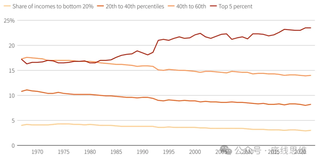 美国不同层级的收入占比情况。统计显示,过去几十年来,只有最富有的5%人群,其收入占比还在不断上升 图表来源:路透社