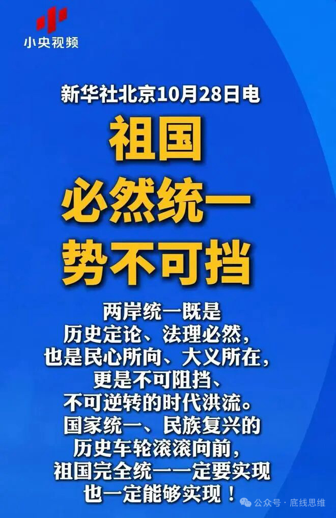 大家是不是也能感觉到统一进程已经开始了?最近还发生了好几件事:第一是10月25日在法律意义上被正式确认为“台湾光复纪念日”。这是在向国际上宣示,台湾早已光复,早就是我们家的,没有争议。用这个事实在法理上证明台湾已经是我们的一部分了,台湾事务是我们家里的事。第二是重庆公安机关对“黑熊学院”组织人员沈伯洋进行了通缉。第三,新华社连续三天发布署名文章,在舆论场上强调祖国必然统一势不可挡,并且出现了“回归祖国有七大好处”之类的提法,与之相伴的还有东部战区同步推进的演习。