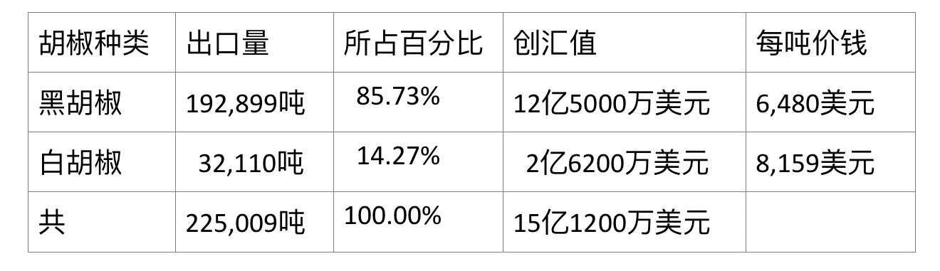 这期间越南国家出口了黑胡椒及白胡椒共225,009吨,获得15亿1200万美元的收入。各类胡椒的出口情况如下表:
