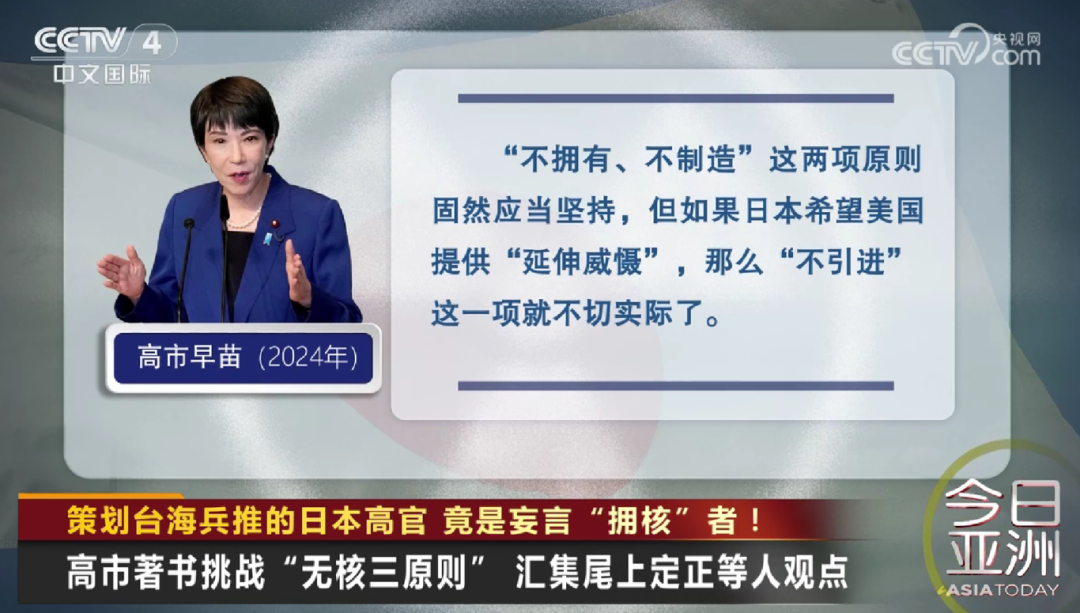 舆论注意到,在2024年出版的《国力研究》一书中,高市早苗写道:“不拥有、不制造”这两项原则固然应当坚持,但如果日本希望美国提供“延伸威慑”,那么“不引进”这一项就不切实际了。