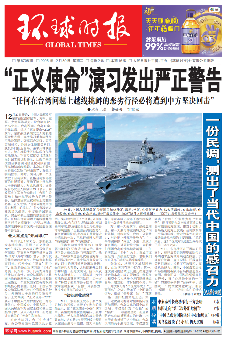 29日早上7时30分,东部战区发布消息称,开展“正义使命-2025”演习。此次演习代号背后有何深意?军事科学院研究员王文娟29 日对《环球时报》表示,演习代号承载着政治意义、战略指向和军事目标。代号中的“正义”两个字,体现的是此次演习反“台独”分裂、反外部干涉,具有充分的合法性与正当性。无论从国际法还是国内法的维度来说,维护主权和领土完整是一个主权国家固有的权利和最核心的利益,任何一个国家的政府和军队都不会对分裂国家的行为、外来势力干涉的行为坐视不管。王文娟说,“正义使命-2025”展示了中国人民维护国家统一的必胜信心。中国政府、中国人民、中国人民解放军对国家主权和领土完整的守护,从来不是口号,而是融进血脉里的“使命”和担当。