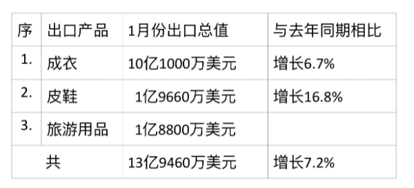 作为东南亚国家之一的柬埔寨国家,成衣、皮鞋及旅游用品是该国最主要的出口产品,这些产品出口值约占总出口的46.5%的比例。这些产品1月间的出口总值等如下表: