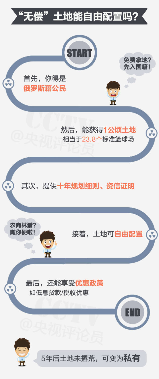 这项仍在讨论中的政策,大概是这样:俄罗斯准备将远东地区土地无偿发送给每一位当地居民,每人1公顷(15亩,或1万平方米),但条件必须是俄罗斯藉公民,而且必须有如何开发所获得土地的十年规划细则,并有资信证明。