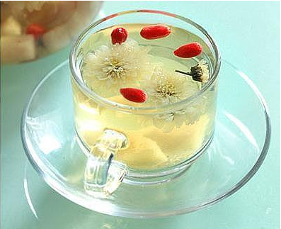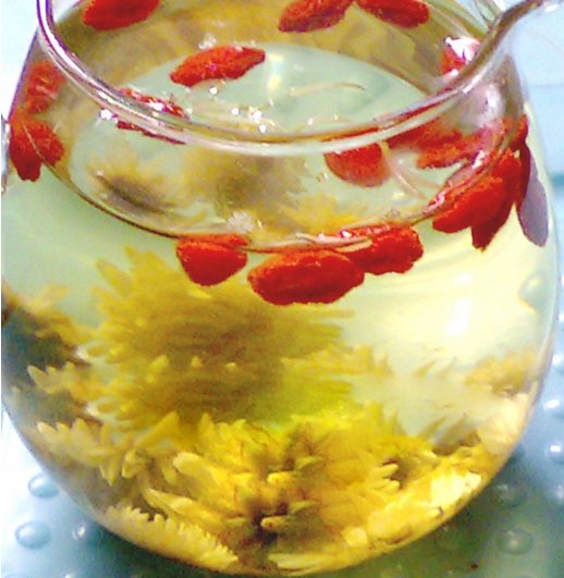 枸杞菊花茶是用菊花和枸杞同泡而成。每次用杭白菊、枸杞各10克加入大茶壶内,加入热开水,10分钟后便可饮用.枸杞对于养精益气,温热滋补有很强的功效。