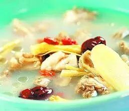 当归20克,生姜30克,羊肉500克,黄酒、食盐等调味品各适量。当归洗净,用清水浸软,切片备用。生姜洗净,切片备用。羊肉剔去筋膜,放入开水锅中略烫,除去血水后捞出,切片备用。当归、生姜、羊肉放入砂锅中,加入清水、黄酒,旺火烧沸后撇去浮沫,再改用小火炖至羊肉熟烂即可加入食盐等调味品食用。