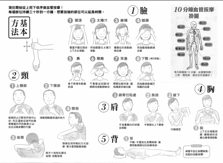 「血管按摩」的动作毫无难度,一日只需10分钟,照著书中的图解血管弹力操,扩张动脉刺激血流,推掉附着于血管的胆固醇和脂肪。对于高血压患者2-3星期便能感受到血压回复正常值、也能有效预防糖尿病并发症、舒缓类风湿性关节炎,以及避免血管阻塞造成中风。
