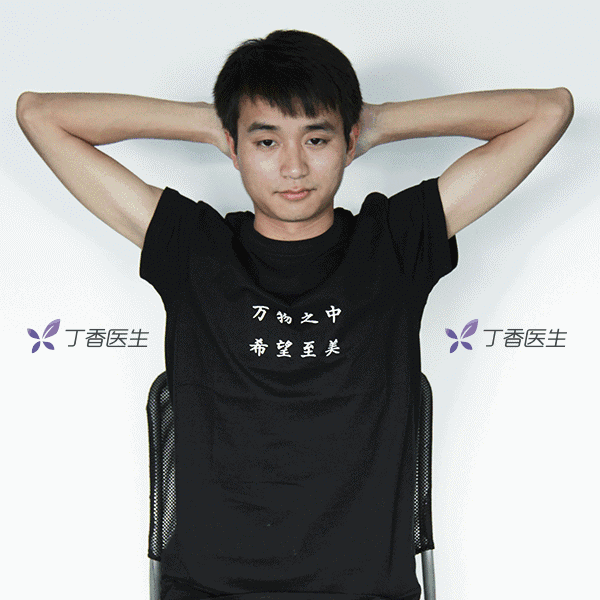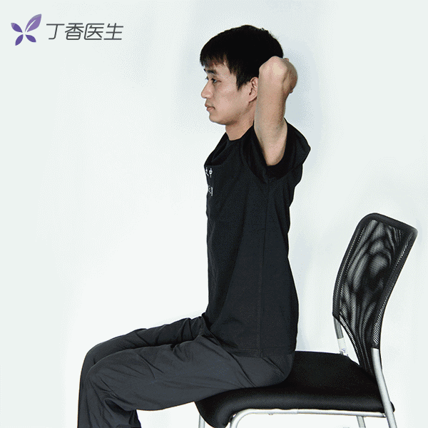 坐在椅子上,双手交叉置于头后,躯干向前后屈伸