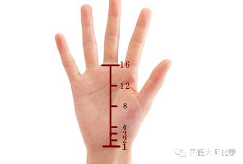 具体的位置是:从腕横纹到中指指根横纹虚拟一条直线,腕横纹点为1,指横纹点为16,平均点16个点。