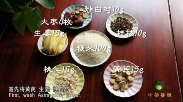 做法:黄芪、生姜、桃仁各15克,炒白芍、桂枝各10克,粳米100克,大枣4枚。首先将黄芪、生姜、炒白芍、桂枝、桃仁和大枣洗净后一起放入砂锅内,加入500毫升水浸泡,药浸透之后开始煎取药汁,大火煮开后,再用文火煎20分钟,去渣留汁备用。