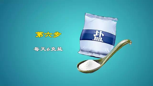 第六步,盐摄入量一定要控制,每天不超过六克,盐过量会使我们钠潴留,造成高血压;
