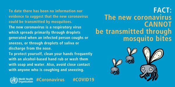 迄今为止,没有任何信息或证据表明蚊子可能传播新型冠状病毒。新型冠状病毒是呼吸道病毒,它主要通过接触已感染者咳嗽或打喷嚏时产生的呼吸道飞沫,或通过接触其唾液或鼻涕而传播。为保护自己,勤用含酒精成分的免洗洗手液或肥皂和清水洗手,并避免与咳嗽或打喷嚏者密切接触。