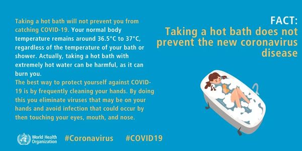 洗热水澡不能预防新冠病毒肺炎。不管您洗澡或淋浴温度如何,您的正常体温仍会保持在36.5℃至37℃之间。事实上,洗热水澡时,如果水温过热是有害的,可能会烫伤您。勤洗手是防范的最好方法,可以清除手上的病毒,避免因手触碰眼睛、嘴巴和鼻子而可能发生感染。