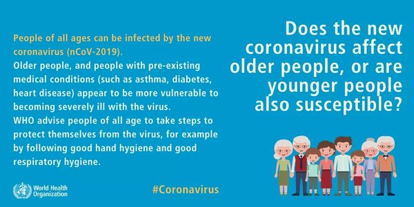 所有年龄段的人都可能受到新型冠状病毒的影响。年龄较大和患有哮喘、糖尿病、心脏病等疾病的人感染该病毒的可能性也许更大。