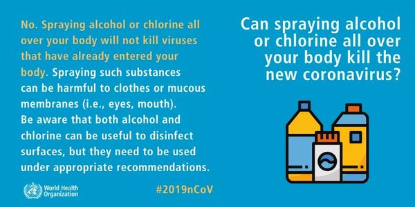 不能。全身喷洒酒精或氯不会杀死已经进入体内的病毒。喷洒此类物质可能对衣服或粘膜(即眼睛、口腔)有害。请注意,酒精和氯可能对消毒各种表面有用,但是使用时须遵循适当的建议。