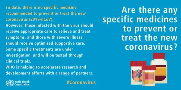 那些感染病毒的人应该接受用于缓解和针对症状的治疗,而病情严重的患者应得到针对其所有症状的最佳的支持性治疗。特定的治疗方法正在研究中,并将通过临床试验进行测试。世卫组织正与合作伙伴一起帮助加速研究和开发工作。
