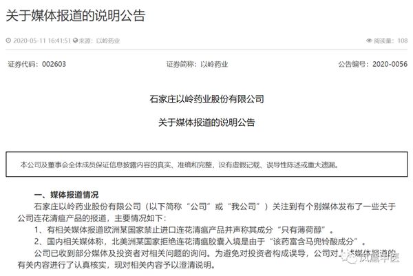 对此,连花清瘟的生产方以岭药业近日还发布公告,并做出了明确的回应: