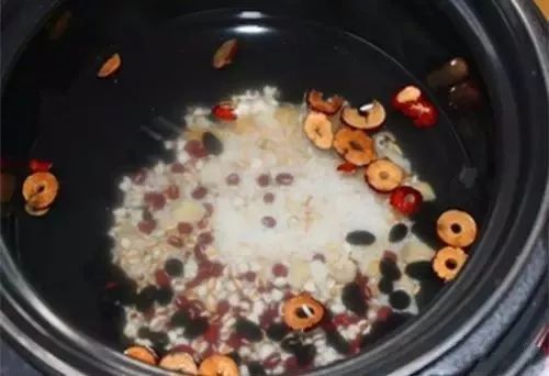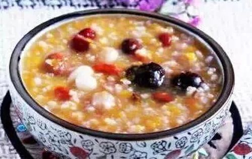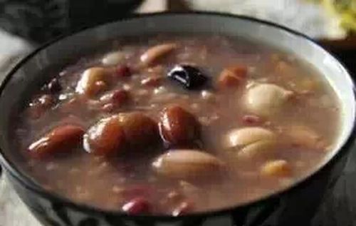原料:大米30克、小米30克、糯米30克、薏米30克、赤小豆30克、绿豆30克、红芸豆50克、莲子40克、枣20克、桂圆肉30克、花生仁30克、玉米糁50克