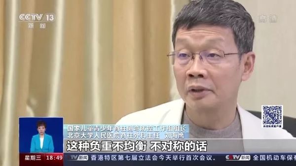 国家儿童青少年脊柱侧弯防控工作组组长、北京大学人民医院脊柱外科主任 刘海鹰:像躺着的情况下的话,脊柱之间、椎体与椎体之间,它的压力如果是1的话,你站起来的话中间压力是2,然后的话你坐着的情况下就是4倍的压力,坐姿不好的话,屁股撅着,往前哈着腰的情况下,腰骶部这种负荷量能达到8倍。弯腰的情况下,拎重东西,这种负荷更大,甚至达到10倍以上。一次没问题,但是的话久而久之,椎间盘就会过早老化、退变、增生,进而产生退变侧弯也好,有的滑脱也好,有的狭窄也好,这样或者那样的问题都会出现。