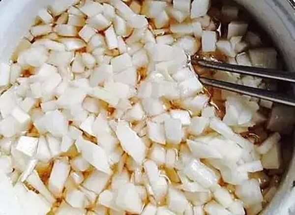 取半瓶蜂蜜,将切好的萝卜粒倒入蜂蜜中,萝卜倒入的量是根据蜂蜜的高度决定的,就是说蜂蜜多少高度,萝卜也倒入相应的高度的量。