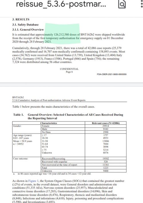 辉瑞声称,截至2月21日,他们收到了3,067份病例报告,其中1,013 份得到医学证实。在他们报告时,有547个未解决,558个已解决,而136个被证明是致命的。