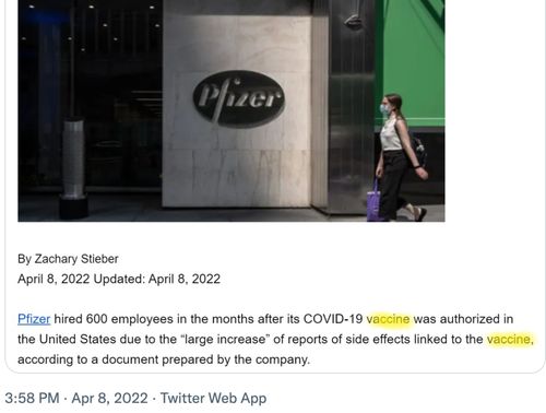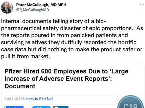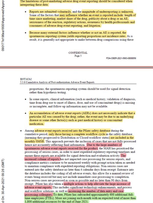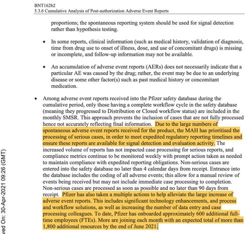 辉瑞公司文件显示大量自发性不良事件报告激增,在其COVID-19疫苗获得授权后的三个月内额外雇佣了大约600名全职员工来处理不良事件报告。
