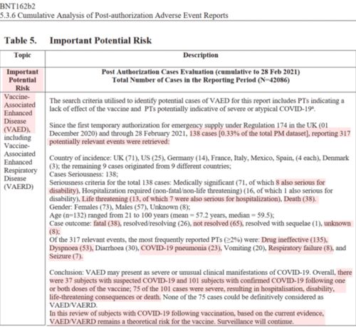 辉瑞文件中说了,截至2021年2月28日,报告了317起可能与疫苗相关的抗体依赖增强(VAED)疾病事件。