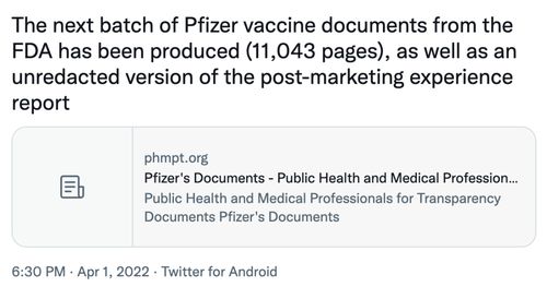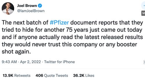 Joel Brown:下一批他们试图隐藏75年的Pfizer文件报告来了,4月1日刚刚发布,如果有人真的阅读了最新发布的结果,他们将永远不会再相信这家公司或任何加强剂。