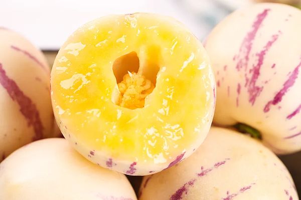 我们常买的人参果单果重80克左右,成熟的果实为米黄色或奶油色,并带紫色条纹,呈圆形、椭圆状或细长形等。果实皮薄肉厚,果肉清香多汁、风味独特,果中无核,可食率在90%以上。