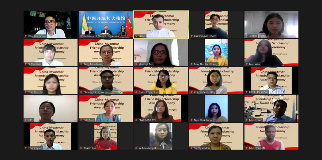 10月9日,中国驻缅甸使馆举办2021年“中缅友好奖学金”线上授奖仪式。陈海大使致辞,使馆文化参赞潘峰、新公处主任冯丽萍及获奖学生代表、留华学生联合会代表、新生代表等60余人出席。