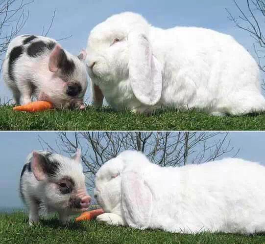 2010年5月,英国彭尼维尔农场的一头小猪和一只巨型兔子成了好朋友,这成了农场的一个奇观。该农场位于德文郡巴克法斯特利,是当地的一个旅游景点。