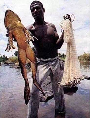 2011年8月,非洲一男子展示他在河中捕获到的大青蛙。这个大青蛙生活在喀麦隆南部和赤道几内亚北部炎热潮湿的原始森林和大河中。一般叫做“非洲巨 蛙”,这种巨蛙的生活环境十分特别,只有在这一地区的森林里才能生存,年平均温度在25摄氏度至29摄氏度之间。但是,近30年来,由于附近的村民砍伐森 林和开荒种田,致使巨蛙生活的环境遭到严重破坏。在另外一些地区,河水也受到了污染。尤其是人们的大肆捕杀,非洲巨蛙正面临灭顶之灾。”