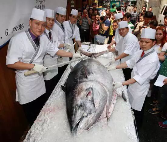 2011年6月,韩国首尔一家饭店的厨师们在展示巨型金枪鱼。当日,一条打捞自济州附近海域的巨型金枪鱼被运送到首尔,成为饭店一景。这条金枪鱼重达350公斤,长达2.7米。