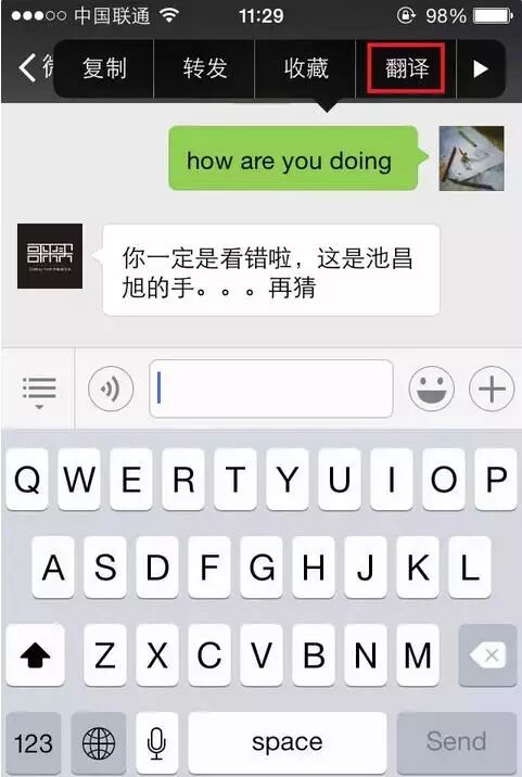 跟外国人聊天,却发现自己的英语竟是体育老师教的……复制到翻译软件?太OUT!长按外文消息,点击“翻译”即可翻译成你的语言。哪里不会点哪里,so easy!
