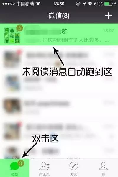 反复双击底部导航栏的“微信”按钮,可以跳到未阅读消息。如果连续双击,可以在各个未阅读消息之间跳转。