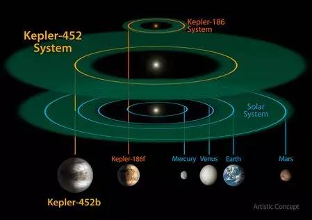 开普勒452b位于1400光年远的宜居带,比地球大60%左右。它可能也是一个岩石星球,有活跃的火山运动、海洋和阳光,不会太冷也不会太热,有液态水。它与恒星的距离相于地球与太阳的距离,它的1年有385天。
