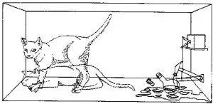 现在我来说薛定谔的实验是什么:把一只猫放进一个封闭的盒子里,然后把这个盒子接到一个装置上,这个装置包含一个原子核和一个毒气设施。原子核有百分之五十的可能性发生衰变,衰变的时候就会发射出一个粒子来,这个粒子一发出来就会触发毒气设施,毒气一触发就会杀死这只猫,就是说猫也处于这种既死又活的迭加状态。这是他想象中的一个实验。