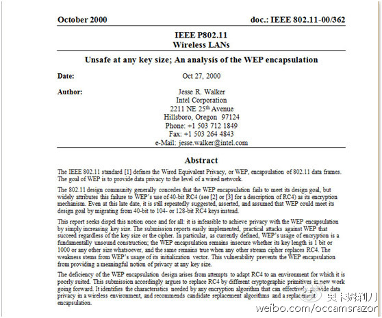 你可能会有疑惑,全世界都在广泛使用Wi-Fi,你有啥资格批评它的安全?其实,Wi-Fi的安全性差并不是我的观点,而是信息安全界的共识,早在2000年,英特尔公司安全架构师Walker就表达了这个观点。