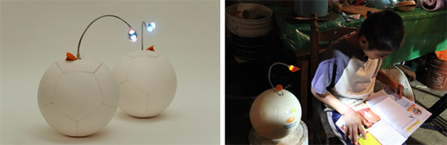 “SOCCKET”简单的就是玩,只要在足球场踢上30分钟,这盏LED 灯就能照明3个小时。玩后打开足球一侧的橙色盖子,安装上LED 灯,即可提供照明电力。
