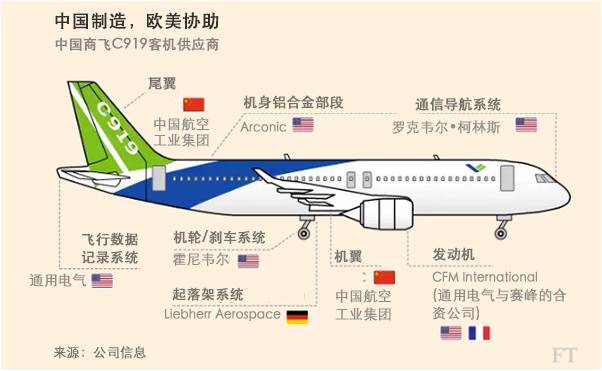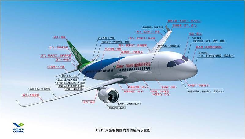 70家企业成为C919的供应商或潜在供应商,其中包括中航工业、宝钢等国字头的央企,有专注于装备制造的民企,还有美国通用电气公司(GE)、霍尼韦尔(Honeywell)等国际巨头的身影。其中,C919的主体部分多为中国造,而发动机和航电系统则融入了外资技术。