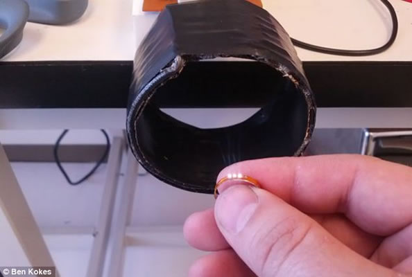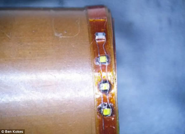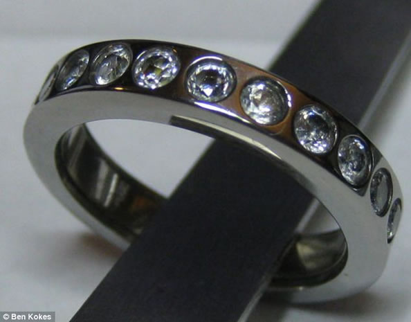 这只戒指内部装有细小的LED 灯,当Ben 靠近时,这些LED 灯就会发光,从背后照亮戒指上的钻石。其具体原理为,将一个铜线圈安装在了戒指的内部,当戒指处于交变磁场时,铜线圈会产生电流,点亮LED 灯。