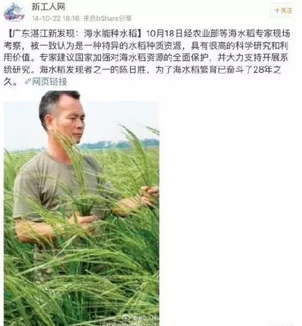1986年,中国“海水稻之父”陈日胜最先发现了一种可以抵抗海水盐碱性的野生水稻,并从此开始了近30年的海水稻培育工作。