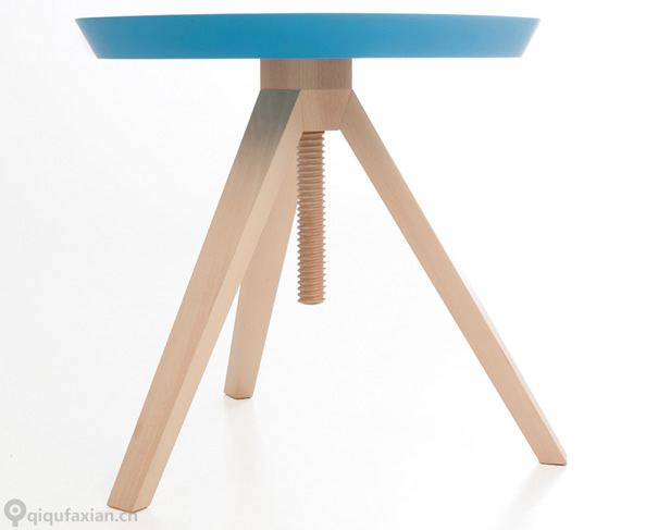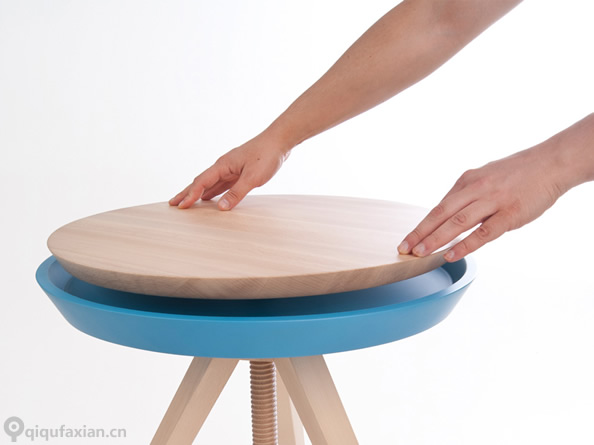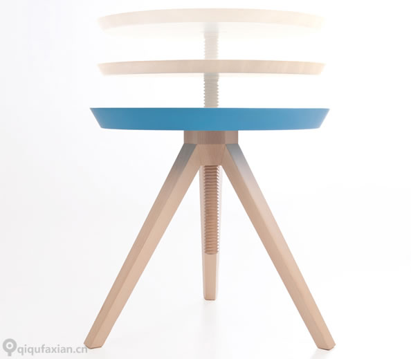 “Giros”这张小巧的三角桌子采用双桌面设计,合体状态下为一个桌面。只要手按住桌面旋转,中间的螺纹杆运作,桌面升起,即变成了双桌面,高度可根据喜好而定。