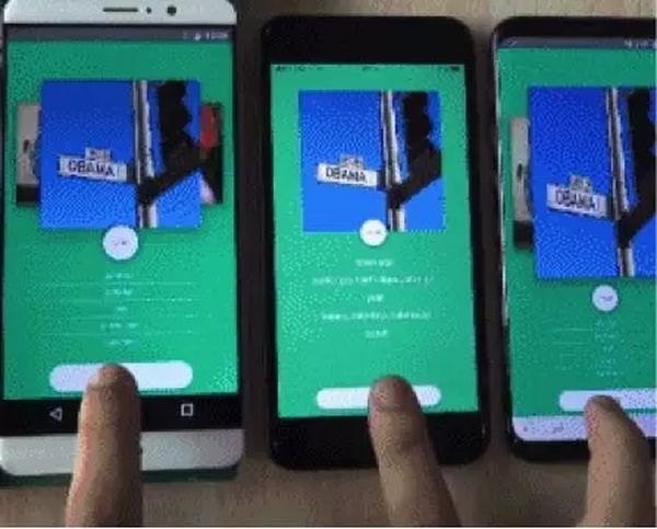 △照片识别速度对比:左为华为手机,中间iPhone 8,右边三星S8