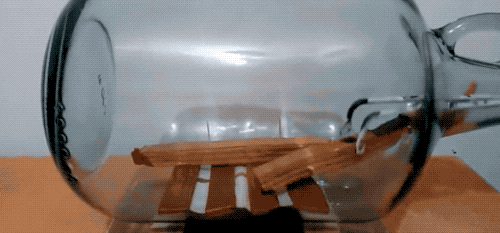 等所有船体零件都用线穿好从瓶口伸进去后,要小心地把总绳索线头留在瓶外,之后用线一拉就撑起来成型啦~再用长棍把小船摆放到合适的位置上。