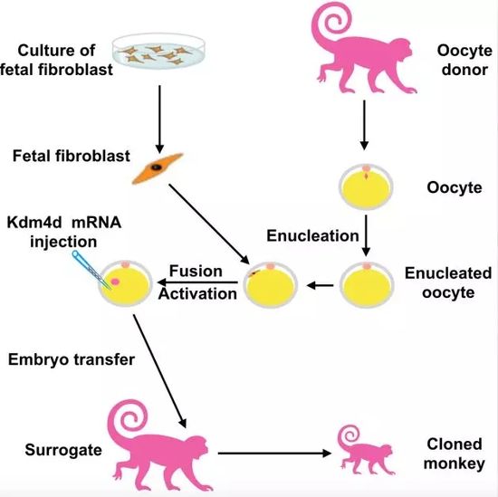 他们研究发现,联合使用组蛋白H3K9me3去甲基酶Kdm4d和TSA可以显著提升克隆胚胎的体外囊胚发育率及移植后受体的怀孕率。在此基础上,他们用胎猴成纤维细胞作为供体细胞进行核移植,并将克隆胚胎移植到代孕受体后,成功得到两只健康存活克隆猴;而利用卵丘颗粒细胞为供体细胞核的核移植实验中,虽然也得到了两只足月出生个体,但这两只猴很快夭折。遗传分析证实,上述两种情况产生的克隆猴的核DNA源自供体细胞,而线粒体DNA源自卵母细胞供体猴。