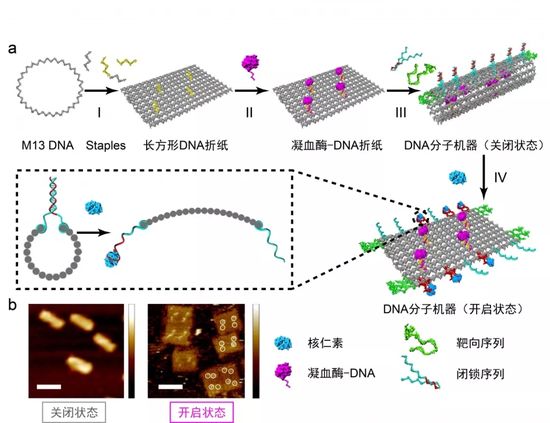 研究人员基于DNA纳米技术构建了自动化DNA机器人,在机器人内装载了凝血蛋白酶——凝血酶。该纳米机器人通过特异性DNA适配体功能化,可以与特异表达在肿瘤相关内皮细胞上的核仁素结合,精确靶向定位肿瘤血管内皮细胞;并作为响应性的分子开关,打开DNA纳米机器人,在肿瘤位点释放凝血酶,激活其凝血功能,诱导肿瘤血管栓塞和肿瘤组织坏死。